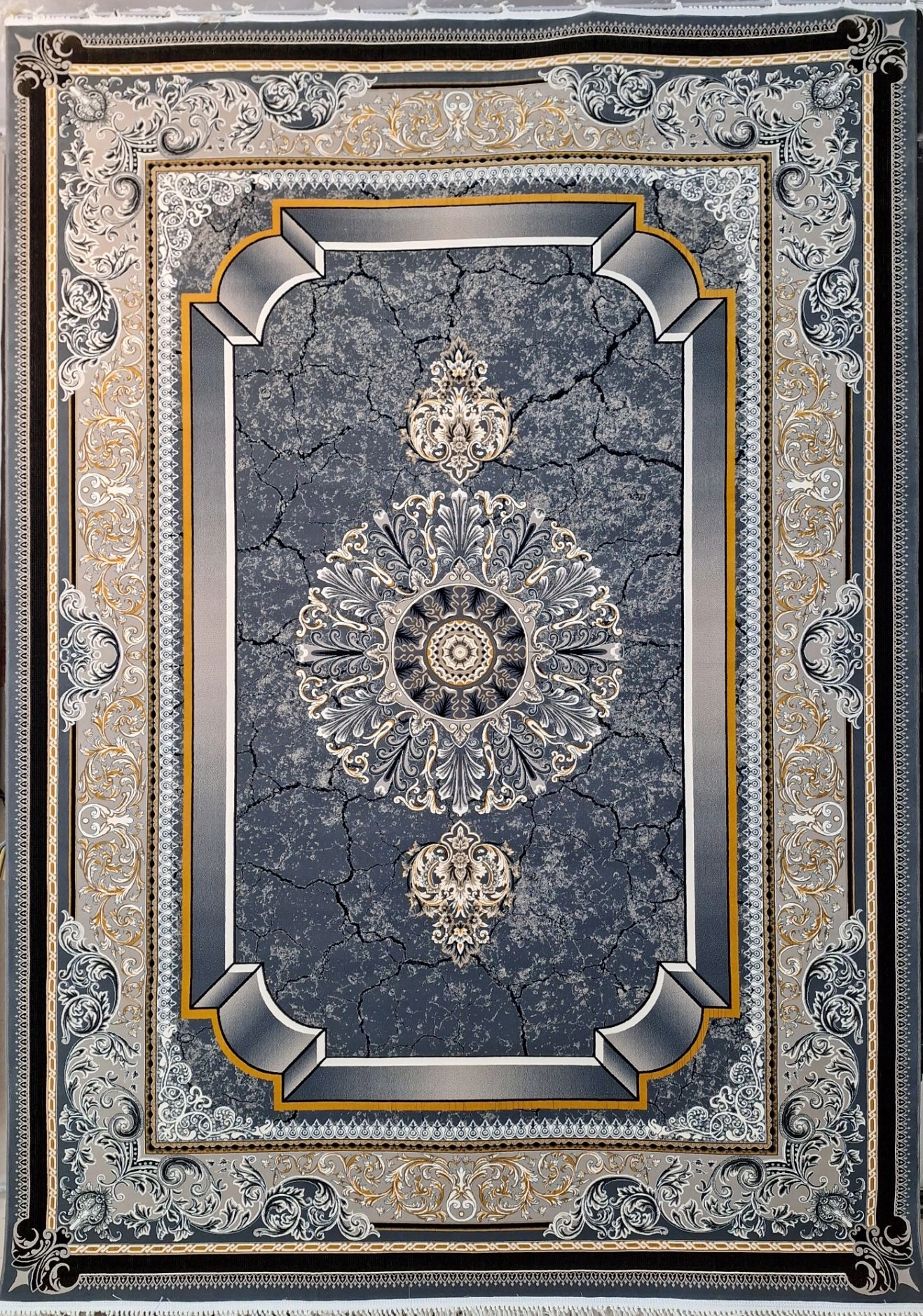 این فرش در رنگ های سرمه ای فیلی دودی طلاکوب در همه سایز بافته شده و برای دکوراسیون مدرن و کلاسیک مناسب است.