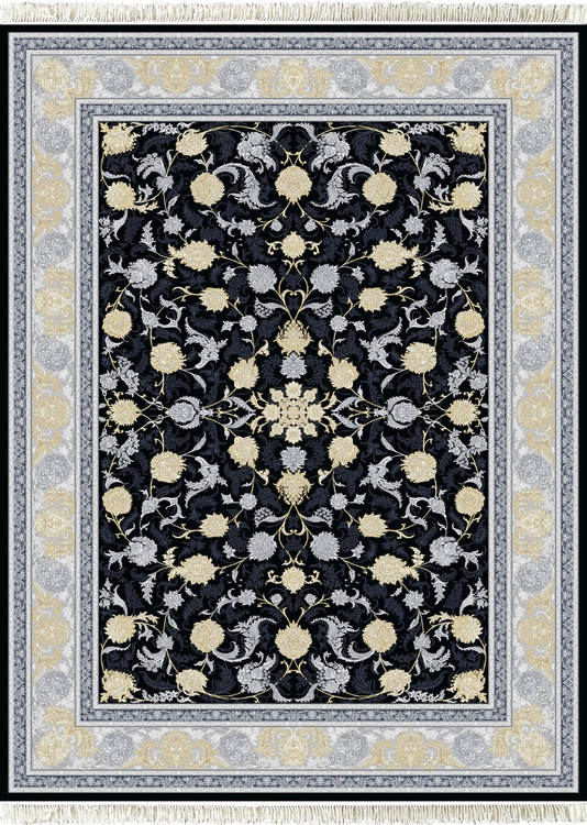 این فرش در رنگ های سرمه ای فیلی دودی طلاکوب در همه سایز بافته شده و برای دکوراسیون مدرن و کلاسیک مناسب است.